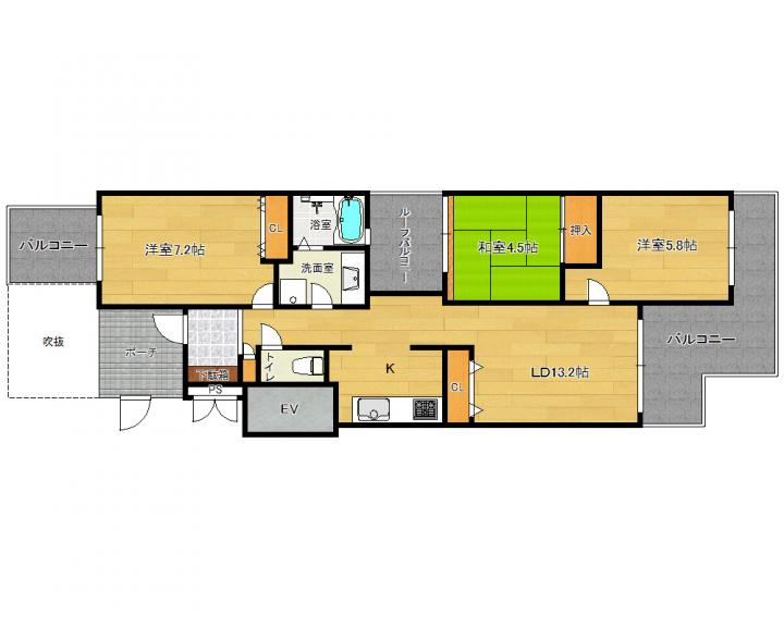| 間取り詳細 | 和4.5帖 洋7.2帖 洋5.8帖 LD13.2帖 K |
