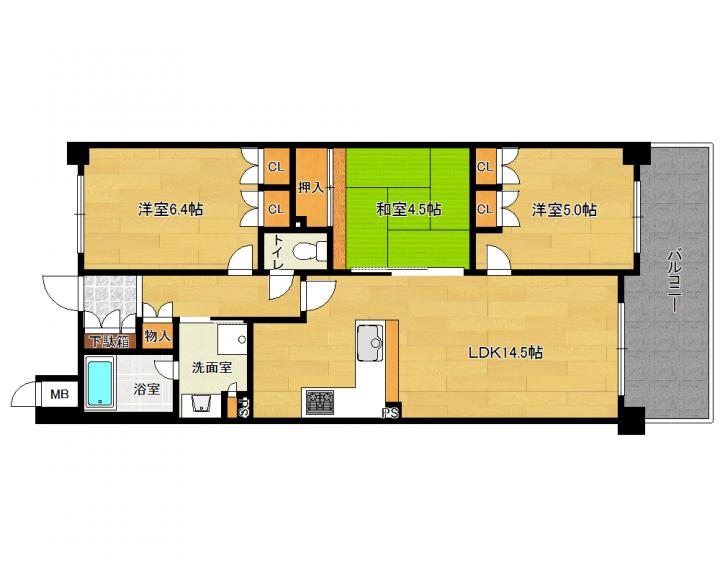 | 間取り詳細 | 和4.5帖 洋6.4帖 洋5.0帖 LDK14.5帖 |