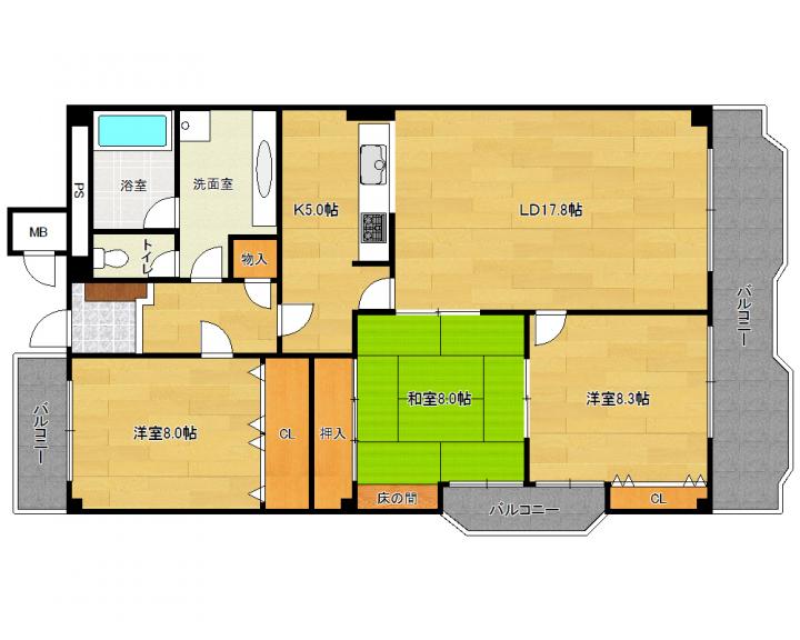 | 間取り詳細 | 和8.0帖 洋8.3帖 洋8.0帖 LD17.8帖 K5.0帖 |