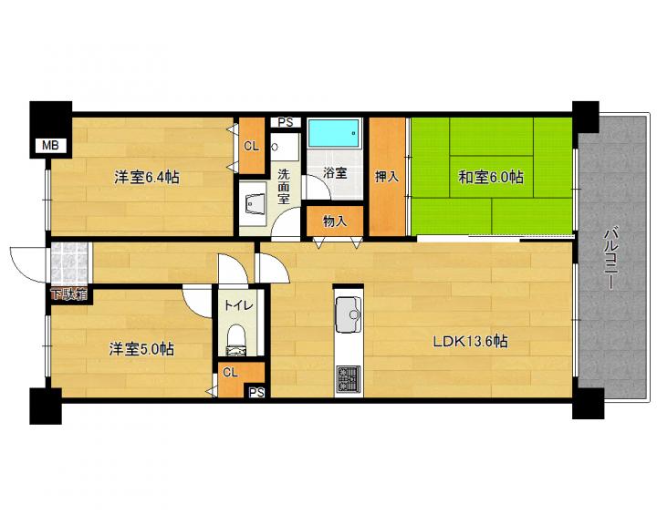 | 間取り詳細 | 和6.0帖 洋6.4帖 洋5.0帖 LDK13.6帖 |