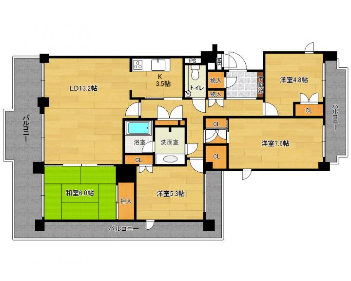 | 間取り詳細 | 和6.0帖 洋7.6帖 洋5.3帖 洋4.8帖 LDK13.2帖 |