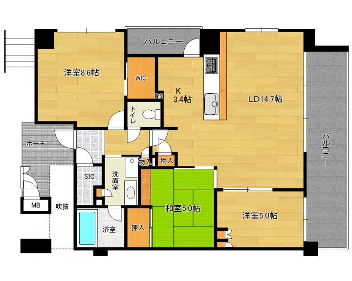| 間取り詳細 | 和5.0帖 洋6.8帖 洋5.0帖 LD14.7帖 K3.4帖 |