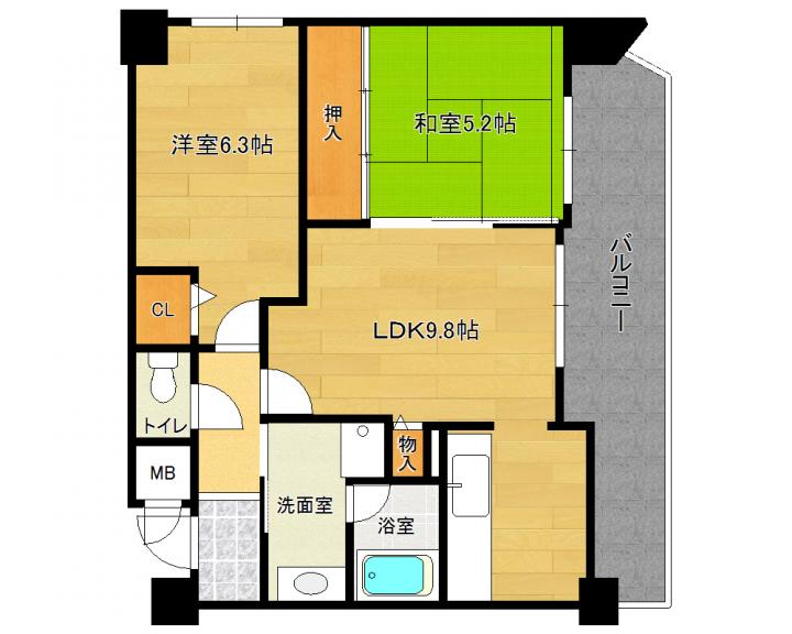 | 間取り詳細 | 和5.2帖 洋6.2帖 LDK9.8帖 |