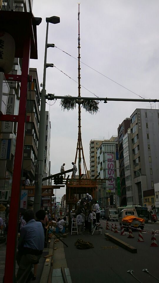 祇園祭前祭り巡行が終わりました。 祇園祭りが終わったかのような感じですが、違うんですよね~ (京都に住んでいるのに)調べてみると7月1日から31日まである長いお祭りだとか・・。 今年は後祭巡行と分かれたので、少し人も少なかったのかな。 さっき、鉾町を歩いていたら、鉾の解体に携わる人たちでいっぱいでした。 解体されていく鉾を写真に収める人やスケッチする人もいて・・・。 あれって釘を一本も使っていないらしい事だけは、聞いた記憶があります。 ホントすごい、人間って。 1100年も前から続いているお祭りなんだとか・・・。 凄いです、京都って!!