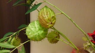 知ってます!? ”風船唐綿” 私は初めて見ました。多分・・・。 この丸いとげとげした実?が付いたの・・・。 花は小さな花でもう終わっちゃっているんですけどね。 熟してはじけると、中に種と綿みたいなのが入っているそうです。 同級生がお花屋さんをやっていて、立ち寄った際に頂いて、 ふわふわ飛ぶ前に種を出して乾燥させて来年植えるといいよと教えてくれました。 珍しいのだけれど、自分の所で育てたのだそうです。 チョット変わった趣で花瓶に挿してみました。
