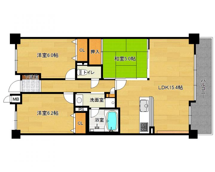 | 間取り詳細 | 和5.0帖 洋6.2帖 洋6.0帖 LDK15.4帖 |