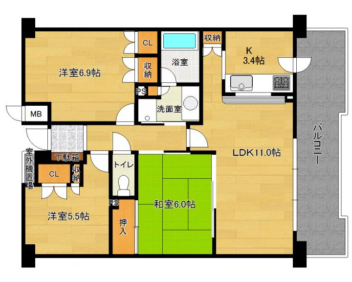 | 間取り詳細 | 和6.0帖 洋6.9帖 5.5帖 LD11.0帖 K3.4帖 |