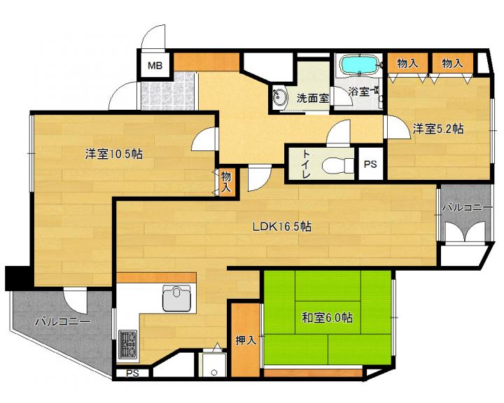 | 間取り詳細 | 和6.0帖 洋10.5帖 5.2帖 LDK16.5帖 |