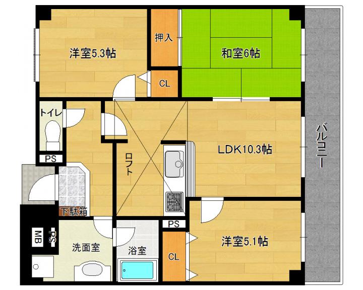 | 間取り詳細 | 和6.0帖 洋5.3帖 5.1帖 LDK10.3帖 |