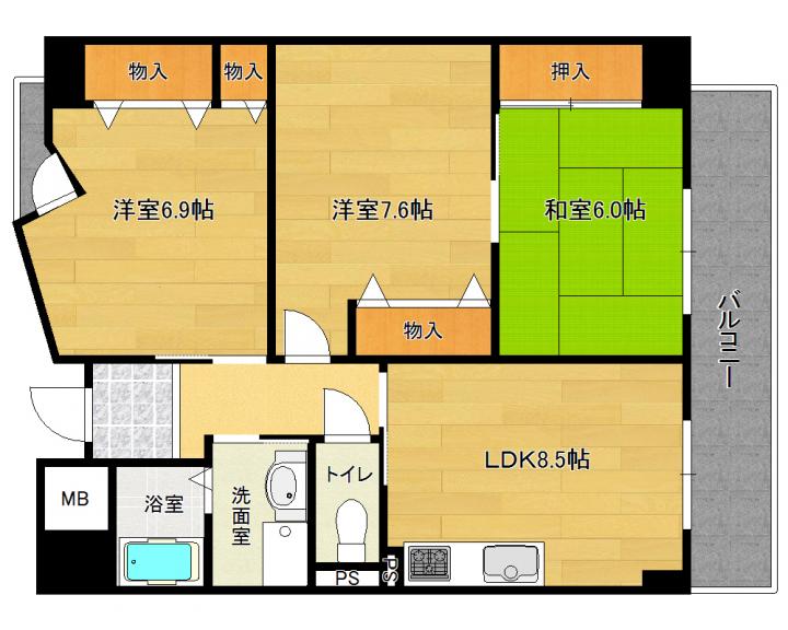 | 間取り詳細 | 和6.0帖 洋7.6帖 洋6.9帖 LDK8.5帖 |