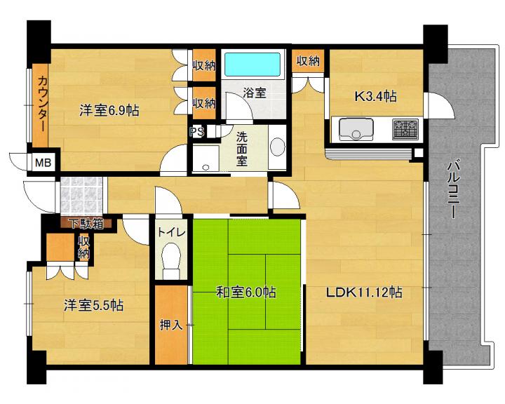 | 間取り詳細 | 和6.0帖 洋6.9帖 5.5帖 LD11.0帖 K3.4帖 |