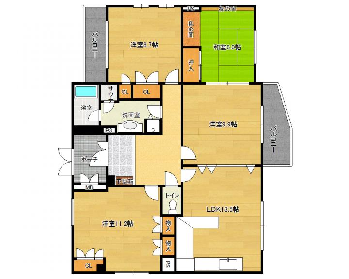 | 間取り詳細 | 和6.0帖 洋11.2帖 洋9.9帖 LDK13.5帖 |