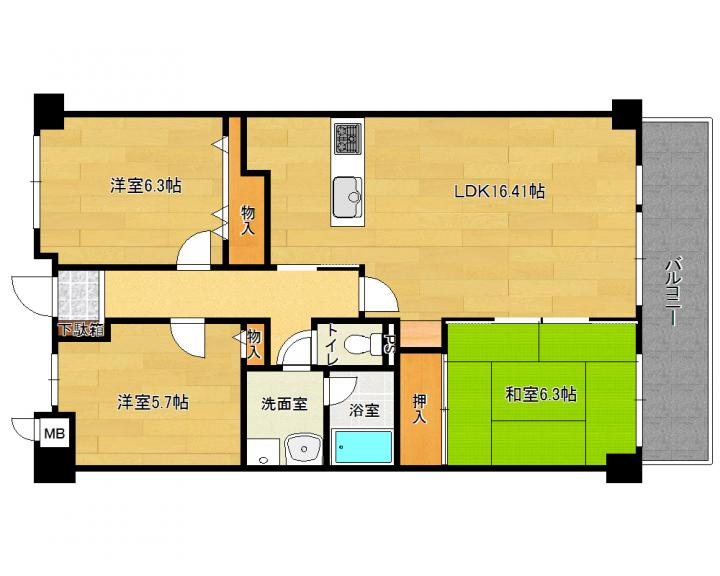 | 間取り詳細 | 和6.3帖 洋6.3帖 洋5.7帖 LDK16.7帖 |